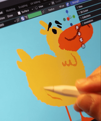 The final exploration takes on a very different drawing style from Nathalia Angely Escalona Perez and is again about the play between 2D and 3D within the image. This time the angle of the character and sharpness of position were the main points to convey in the 3D model, while the details are added with Grease Pencil.