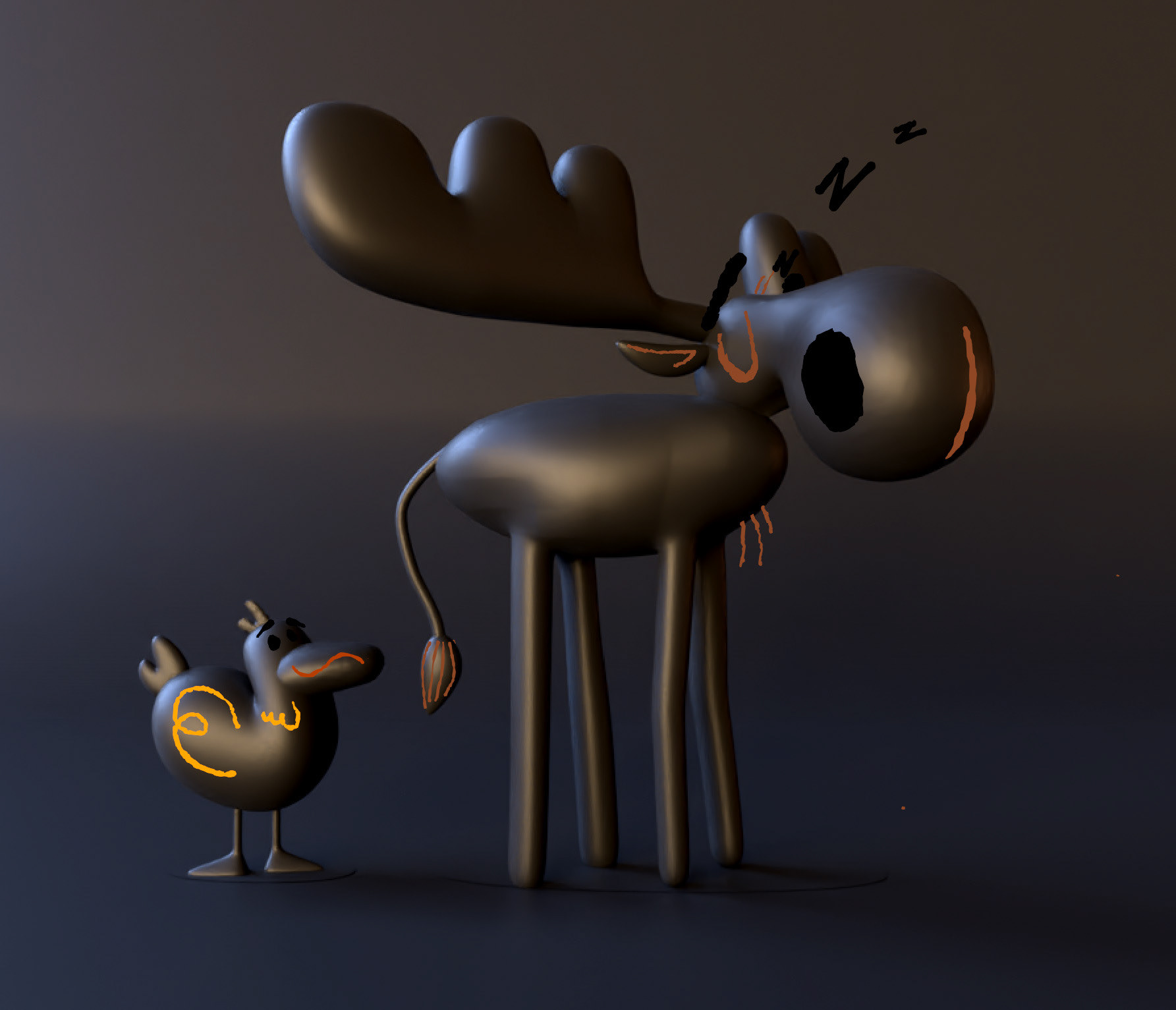 Our starting point was the translation of a 2D sketch into a 3D Character Design and intended as a way of exploring Blender's Grease Pencil feature. We always try to keep the spirit of the original drawing and analyse how, and often why, that can be brought into 3D dimensions.