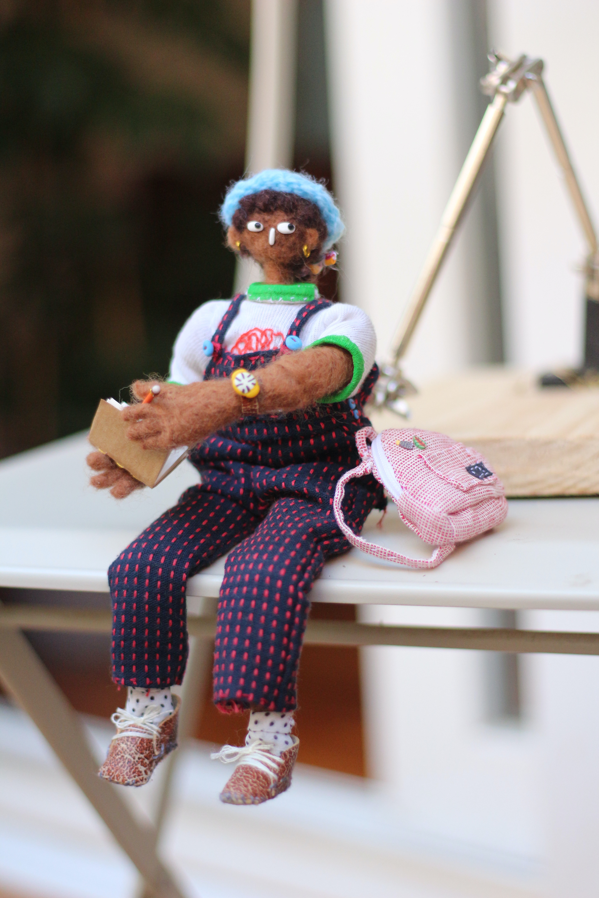 All the items are handmade, including miniature pockets and buttons, and accessories like a mini notebook and bag. All this helps bring our character to life and connect more with the audience.