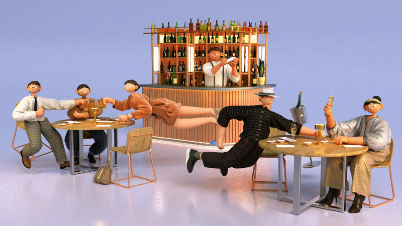 The animations add to the surreal, celebratory nature of the pieces, with shapes swirling around and the settings seemingly coming to life with magical floating elements.