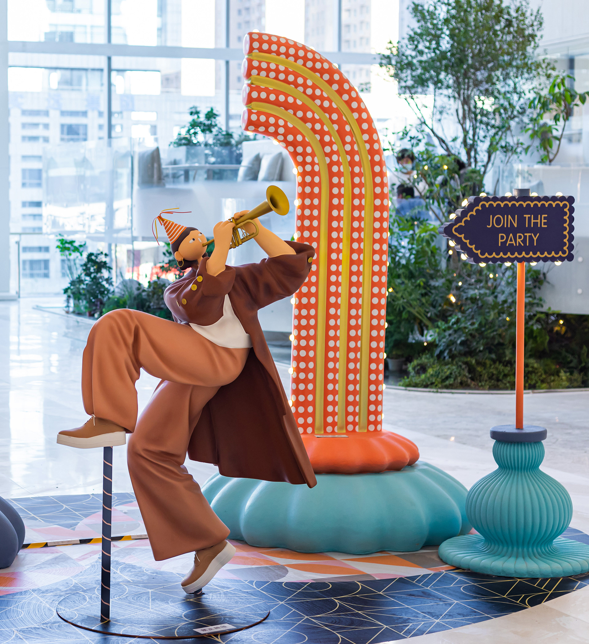 The visual language is unified with similar pastel coloured backgrounds, abstract shapes and a consistent clothing style for the characters. Adapted across different formats - posters, animations, sculptures, decorations - the designs have a consistent style and a familiar and celebratory feeling.