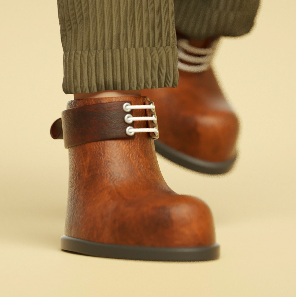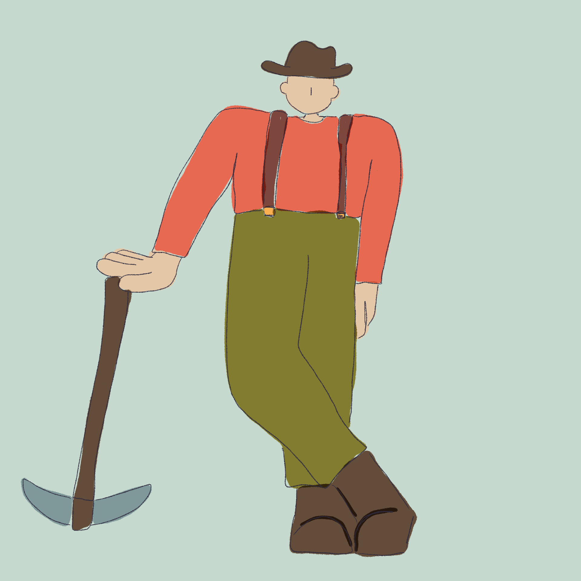 The Gold Rush character's traditional mining outfit has a Cabeza Patata charm with the handmade patterned shirt and the high trousers.